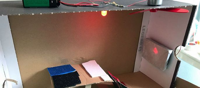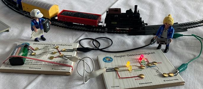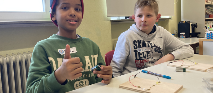 Kinder der 4. Klasse bauen in der AG kleine technische Geräte. Grundslage ist immer das Stromprüfgerät. Dieses wird dann in den folgenden Stunden um Exponate wie Leuchtdioden, Ampelschaltung, Summer und Solarzelle erweitert. Diese können mit Kabeln verbunden werden und lassen somit variable Schaltungen zu.
